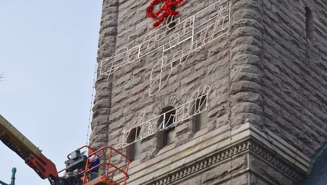 City workers used the boom lift to hoist decorations and fresh lights to the heights of City Hall, installing and then testing them.