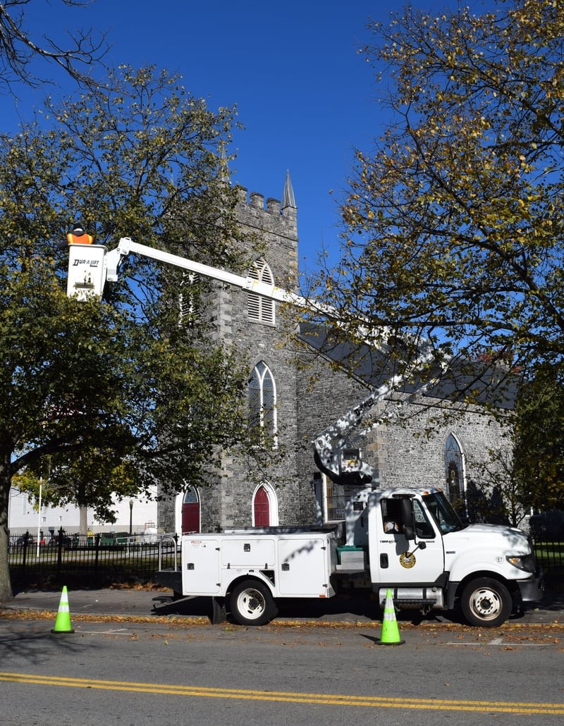 - A worker uses a bucket truck to install lights in front of St. Anne’s Episcopal Church several weeks ago. (Photo Courtesy City of Lowell)