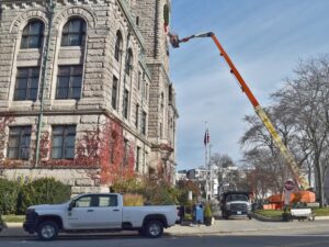 City electricians used a 180-foot boom lift to help them install lights and decorations on City Hall on Sunday. (Photo Courtesy City of Lowell)