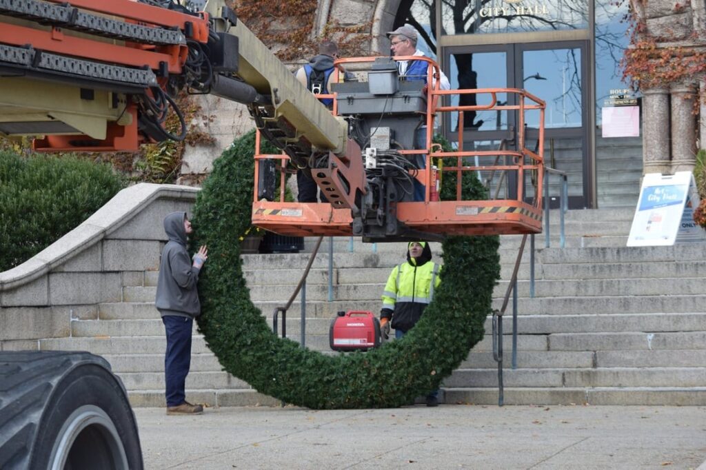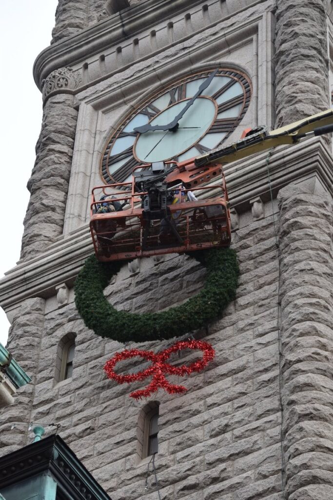 - City electricians prepare to secure a large wreath to the side of the City Hall clocktower. (Photo Courtesy City of Lowell)