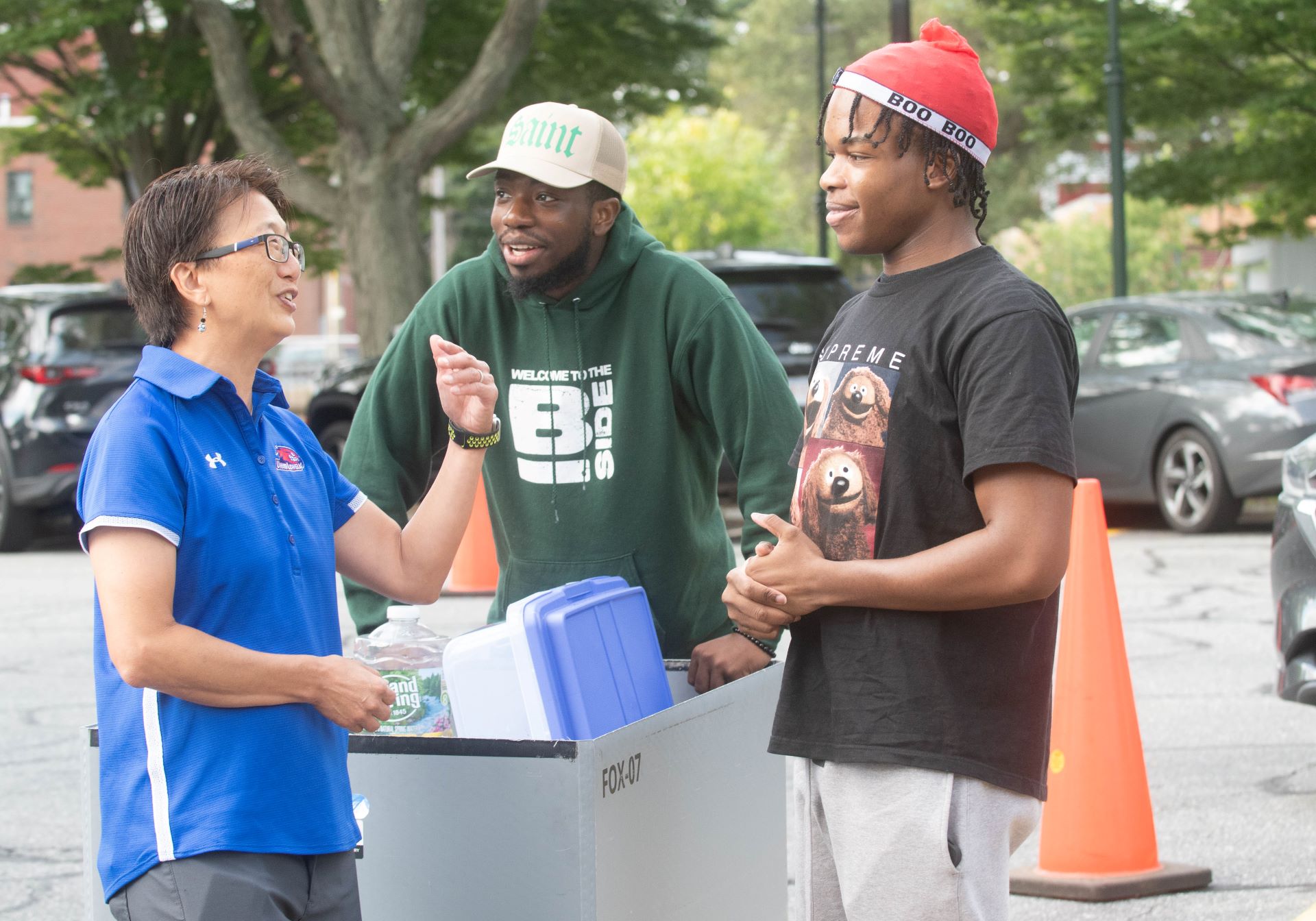 - Chancellor Chen welcomes new student Lens Fanfan, of Roslindale, right, to campus as his cousin, Synsmyr Forgue, helps him move into Fox Hall / Photo by Tory Wesnofske