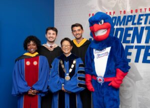 From left: Abigail Cooper, student representative on the UMass Board of Trustees; Student Government Association President Gavin Robillard; Chancellor Julie Chen; and UMass Lowell graduate William Lefebvre and Rowdy the River Hawk. /Photo: Bill McCormack for UMass Lowell