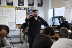 The large black lab benches in Quentin Spinney’s seventh-grade science class at the Bartlett Community Partnership School are covered in notebooks and worksheets; the walls filled with posters depicting planets, the sun, and stars, and tragic teacher-turned-astronaut Christa McAuliffe; hand-written notes about plant structures; the rules of a respectful classroom.