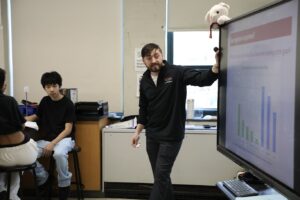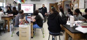 Mr. Spinney walks the room, leading a discussion about how protein builds muscle and how the structures within a muscle contribute to its function.