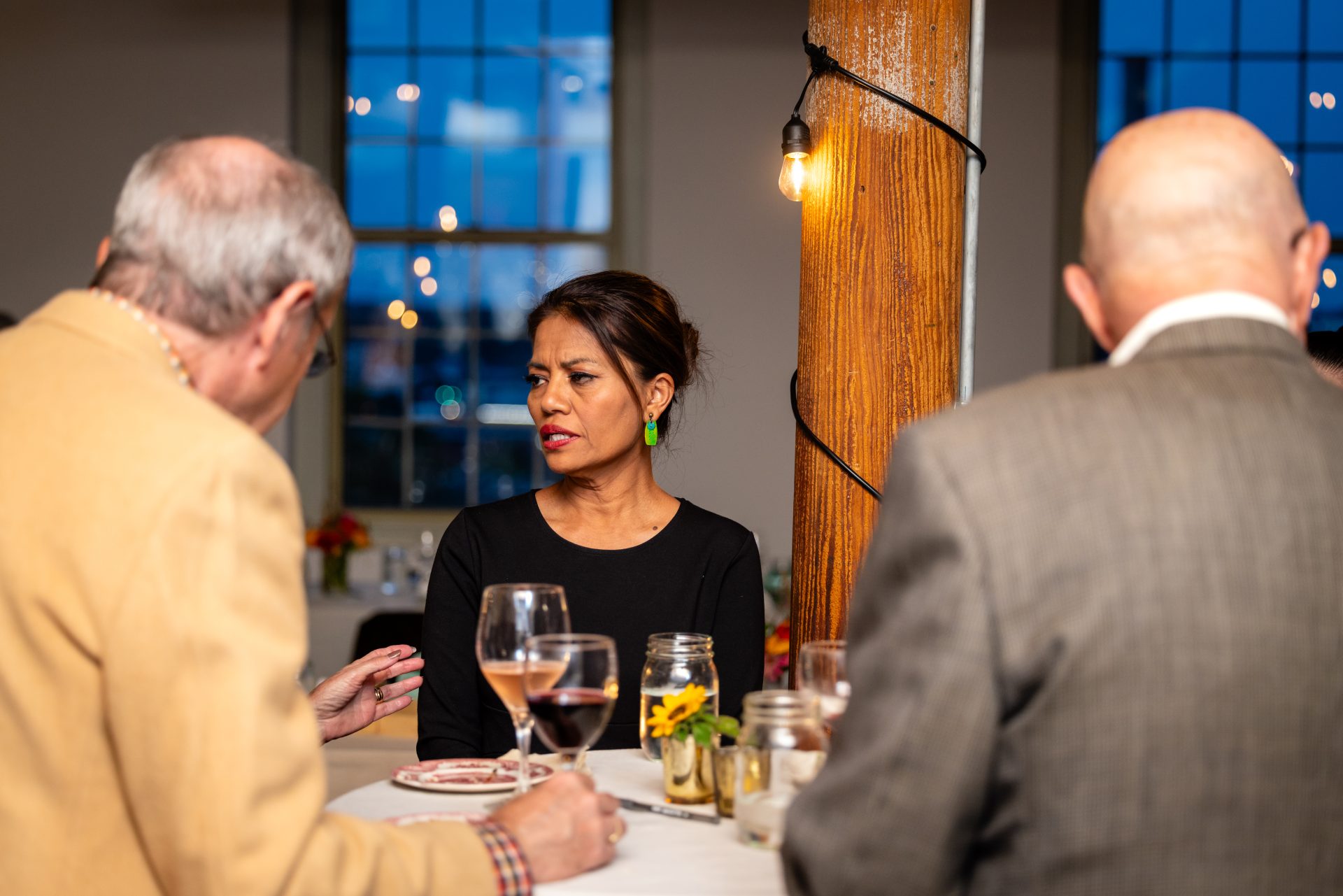 The evening’s festivities were held on the 5th floor of the historic Wannalancit Mills, with many thanks to Farley White Interests for donating the space. The space was dressed for the evening with long tables set with vintage china, flowers picked fresh from the MCG farm and arranged by MCG Education Manager, Daphnne Ekmanis, and beautiful pictures of Mill City Grows’ community gardeners. Music was provided by Will Laughlin. Of course, nature was part of our décor, with the beautiful Harvest Super Moon shining in through the large mill windows.
