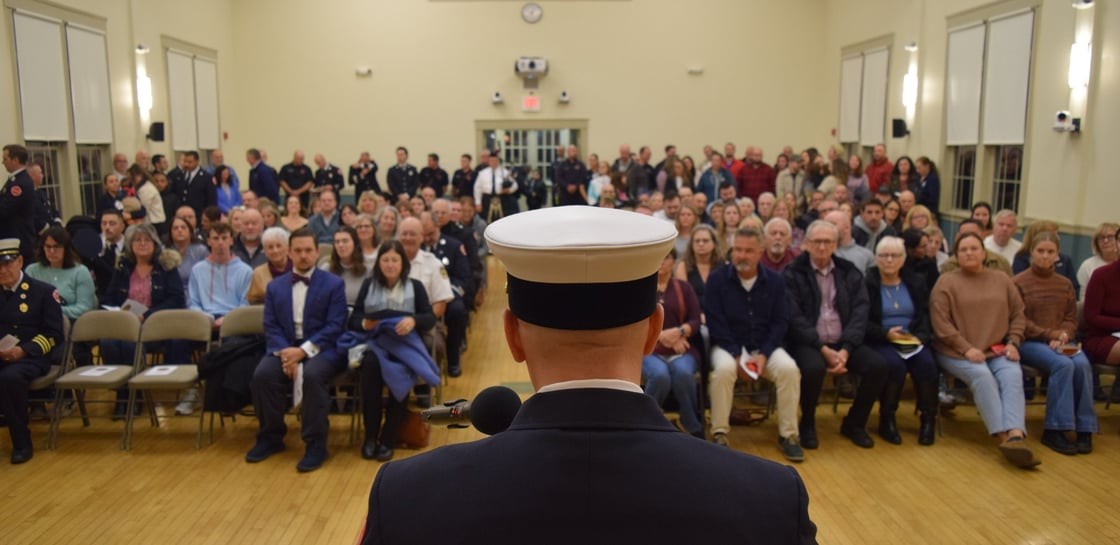 Other firefighters were sworn in, promoted, or recognized for years of service to the community in an annual awards ceremony that left standing room-only for family members and town leaders in Harvey J. Gagnon Harmony Hall.