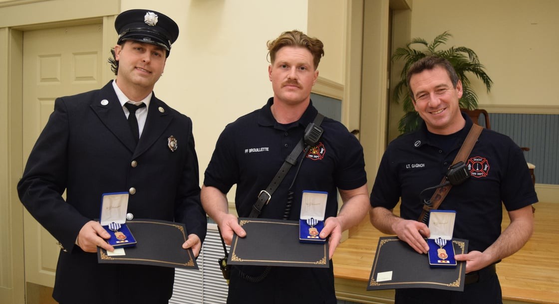 From left, Firefighter Ryan Talbot, Firefighter Chris Coalter, and retired Lt. Paul Martin stand to receive a Rescue Medal from the Dracut Fire Department. Retired Lt. Martin accepted on behalf of his son, the late Firefighter Jacob Martin, who passed away in September. (Photo courtesy Dracut Fire Department)