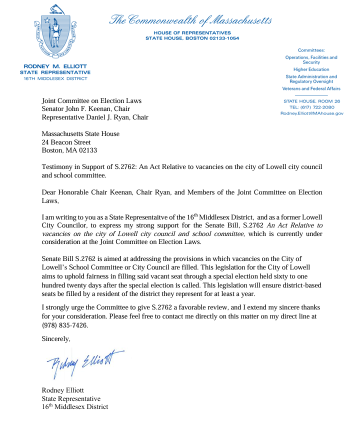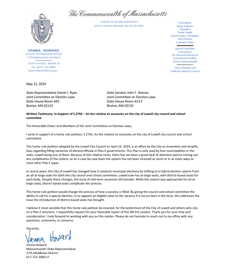 Massachusetts Senate Bill 2762, “An act relative to vacancies on the city of Lowell city council and school committee,” received a hearing with the Legislature’s Joint Committee on Election Laws Tuesday and Wednesday of this week.