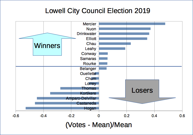 In this graph, Belanger occupies a very special place; while the citizens of Lowell expressed a lukewarm preference for him as can be seen by his positive value, he was the top ranked loser, tenth among all the candidates. The difference between Belanger and the lowest ranked winner was a mere 19 votes, just one half of 1% of the votes decided for Belanger, even less, proportionally, than the difference in the recent District 3 election.