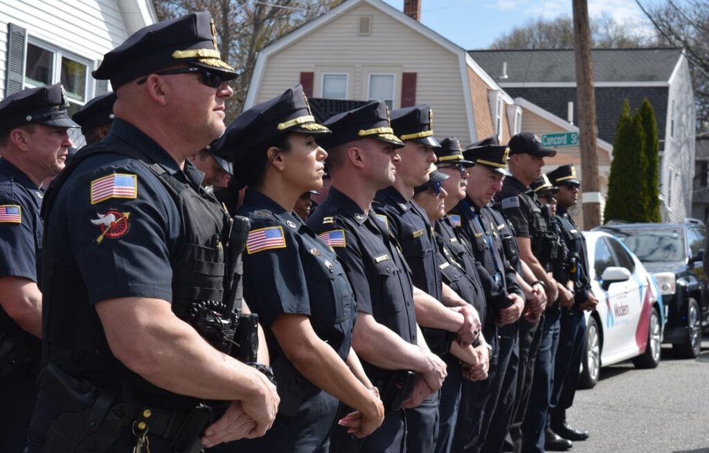 Lowell Police officers and supervisors, including somie retired supervisors, line up to pay their respects to Officer Pearsall during the ceremony. (Photo Courtesy Lowell Police Department)