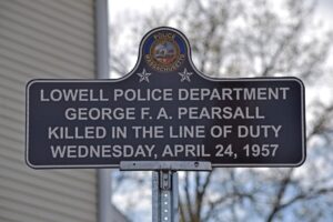 A memorial Hero Sign honoring fallen Lowell Police Officer George F. A. Pearsall now stands at Perry and Alton streets, near where Officer Pearsall was killed on duty in 1957. (Photo Courtesy Lowell Police Department)