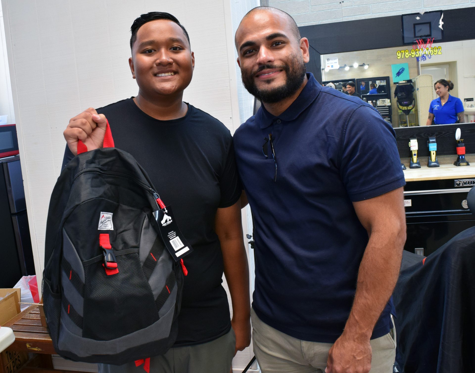 - Bethesda Church of Lowell Pastor Eric Dias, at right, stands with a student after handing out a free backpack at the event. (Courtesy Lowell Police Department)