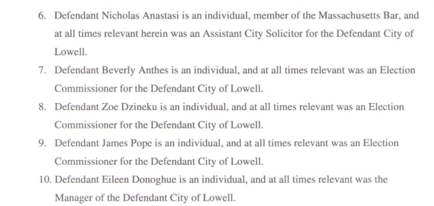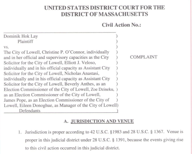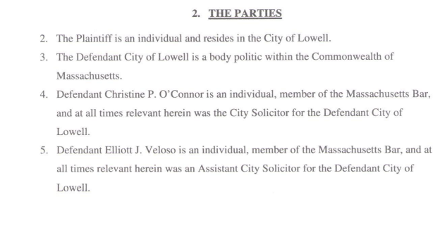 The suit, filed last Thursday in U.S. District Court Boston (Eastern) Division by Lay’s Attorney Roland Milliard, names the City of Lowell as defendant, along with former City Solicitor Christine O’Connor, former Assistant Solicitor Elliott Veloso and former Assistant Solicitor Nicholas Anastasi. All three are named individually and in their official capacities with the City at the time.