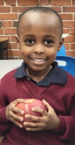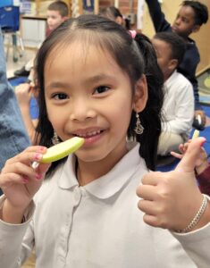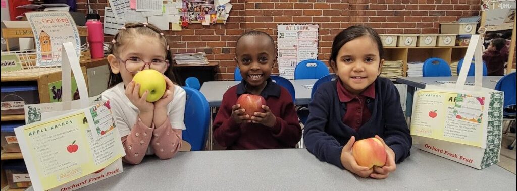 During a nutrition lesson presented by Mill City Grows, kindergarten students in Mrs. Kelly’s class, Briella, Calvin, and Giana, were excited to take home bags containing one each of the three kinds of apples they tasted, Pink Lady, Suncrisp, and Mutsu, as well as a recipe for apple nachos.