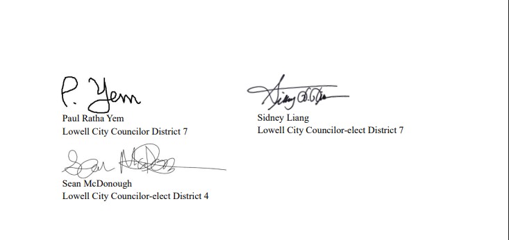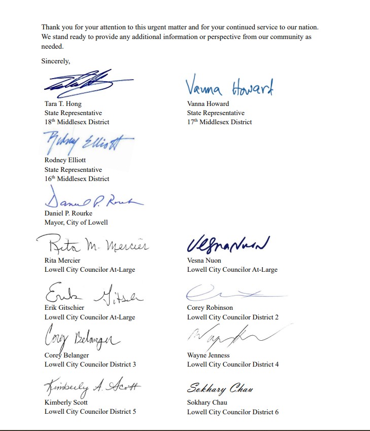 The letter was signed and supported by State Representatives Tara Hong, Vanna Howard, and Rodney Elliott; Lowell Mayor Daniel P. Rourke; Lowell City Councilors Vesna Nuon, Erik Gitschier, Rita Mercier, Corey Robinson, Corey Belanger, Wayne Jenness, Kimberly Scott, Paul Ratha Yem, Sokhary Chau, and City Councilors–elect Sidney Liang and Sean McDonough.