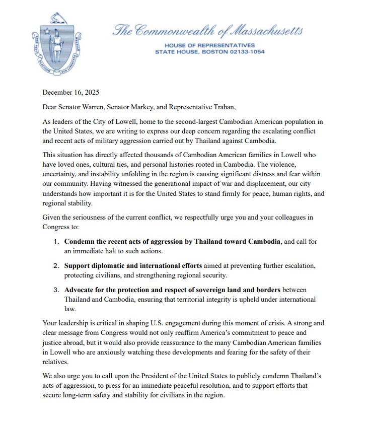 Lowell – Elected leaders from the City of Lowell, home to the second-largest Cambodian American population in the United States, sent a formal letter to Senator Elizabeth Warren, Senator Edward J. Markey, and Representative Lori Trahan, urging immediate federal action in response to the escalating conflict between Thailand and Cambodia.
