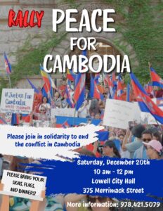 In addition to the letter, there will be a rally calling for peace in Cambodia. The rally will take place on Saturday, December 20th, from 10:00 a.m. to 12:00 p.m. at Lowell City Hall, 375 Merrimack Street.
