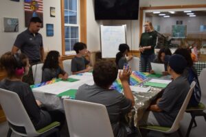 Lead Instructor Cailey Archer, at right, talks to students. At left is Officer Dominic Lessieur. (Photo Courtesy Lowell Police Department)