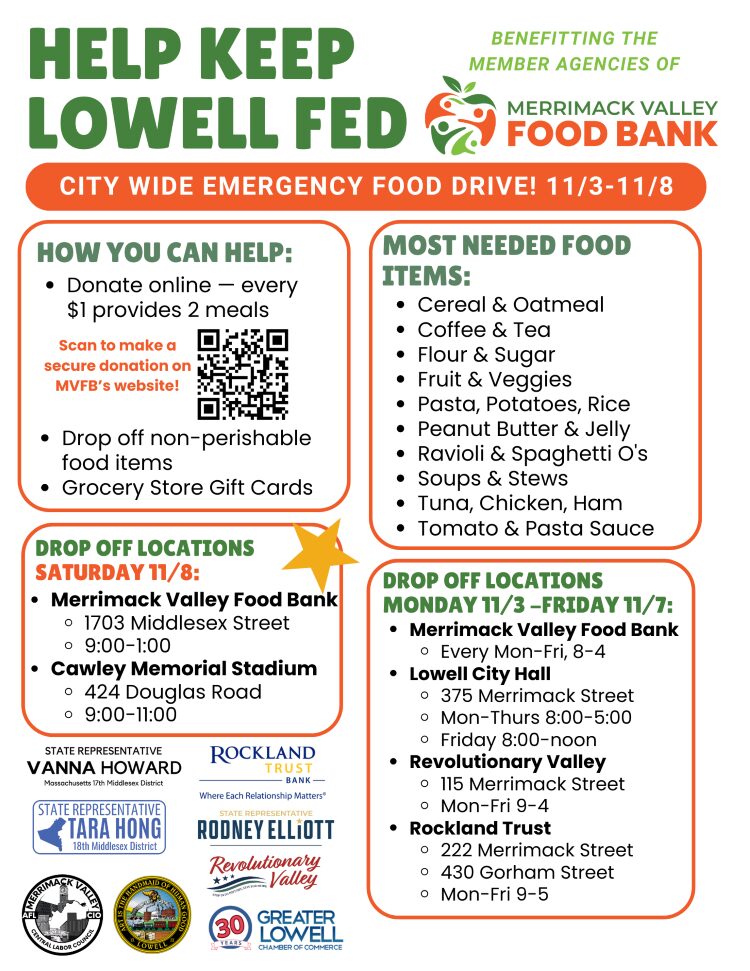 Food and grocery gift cards can be dropped off Monday 11/3 – Friday 11/7 at the Merrimack Valley Food Bank (1703 Middlesex Street, Lowell), Lowell City Hall, Revolutionary Valley, and the Rockland Trust locations on Merrimack Street and Gorham Street. On Saturday 11/8, donations can be dropped off at the Merrimack Valley Food Bank from 9am-1pm or at Cawley Memorial Stadium from 9am-11am. Financial donations are also needed, and can be made online at www.mvfb.org.