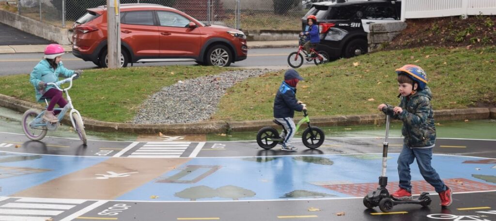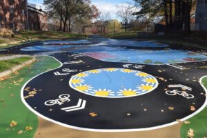 Road lanes, stop signs, and recognizable Lowell landmarks are painted onto the playground’s asphalt surface, creating pathways for young riders to follow and practice on.