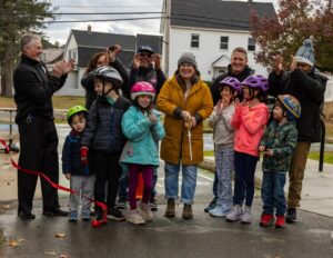 City Councilors Corey Robinson and Erik Gitschier and state Rep. Rodney Elliott joined children who cut the ribbon to the new McPherson Park Traffic Playground on Sunday morning. (Photo Courtesy City of Lowell)