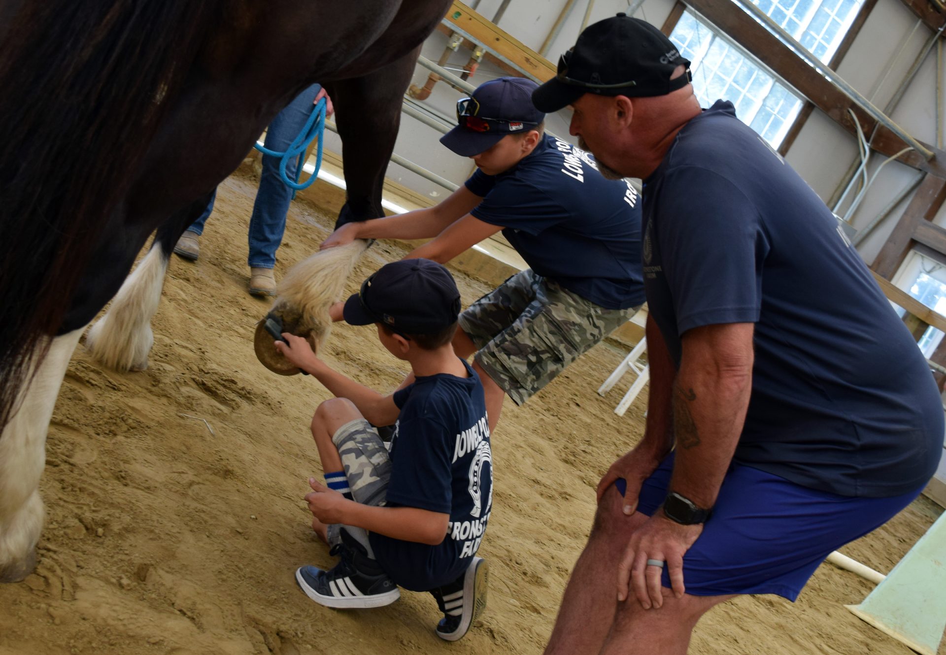 - Dave McCann, of Challenge Unlimited at Ironstone Farm, watches as two students learn to clean the hooves of a horse. (Courtesy Lowell Police Department)