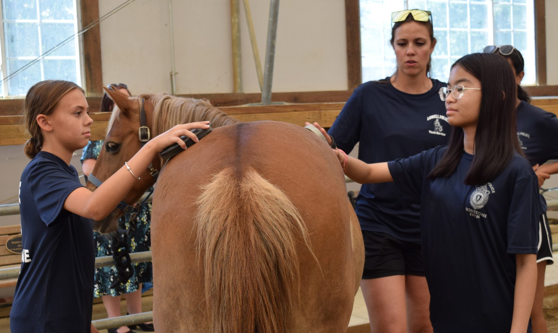 - Officer Erica Torres, second from right, helps two students as they learn to groom a horse. The riding program has students first learn to be comfortable around the horses before they attempt to ride. (Courtesy Lowell Police Department)