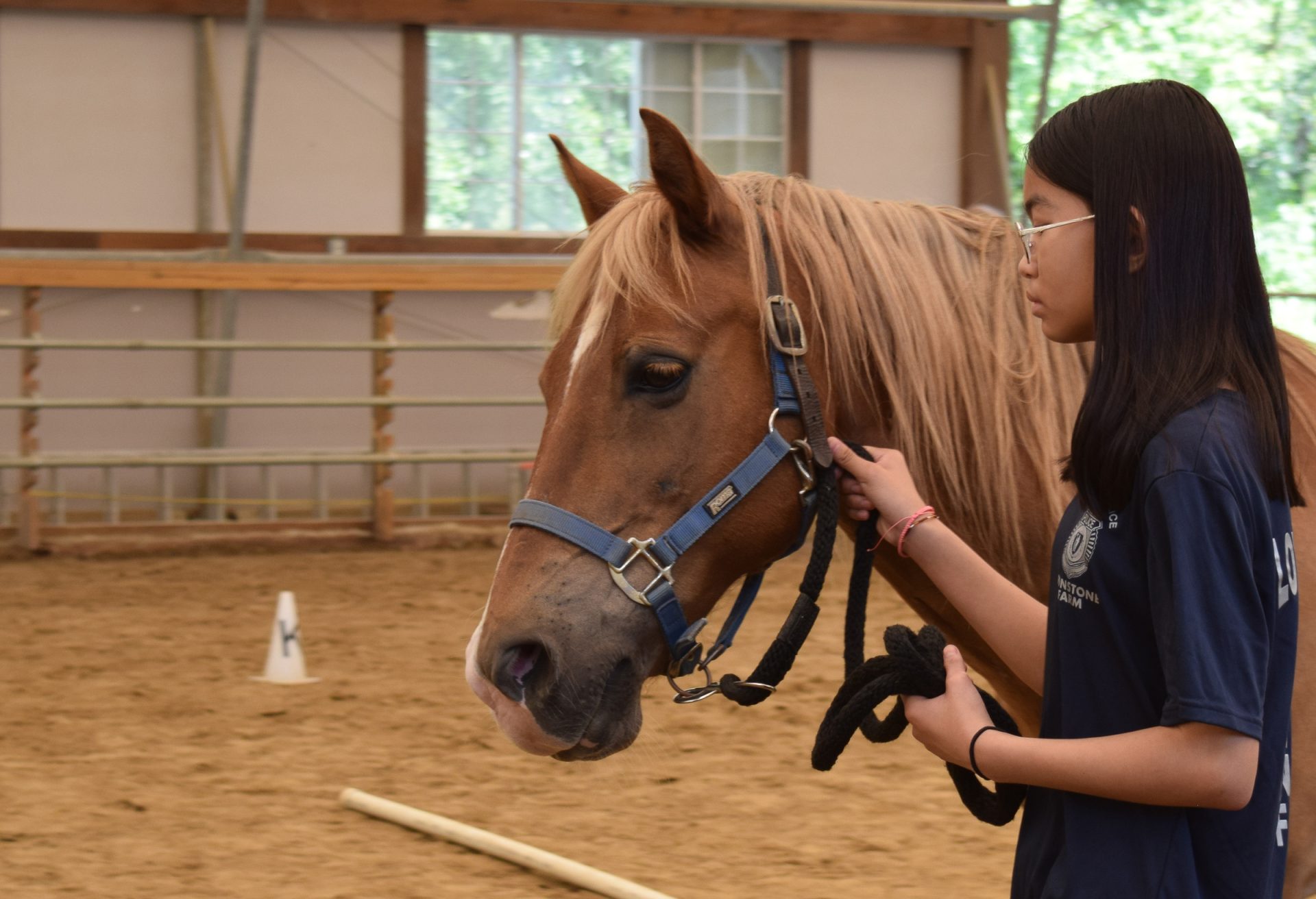 - A student leads Bear around the arena at Challenge Unlimited at Ironstone Farm. Students learned to groom and lead the horses to build confidence and comfort before attempting to ride them. (Courtesy Lowell Police Department)