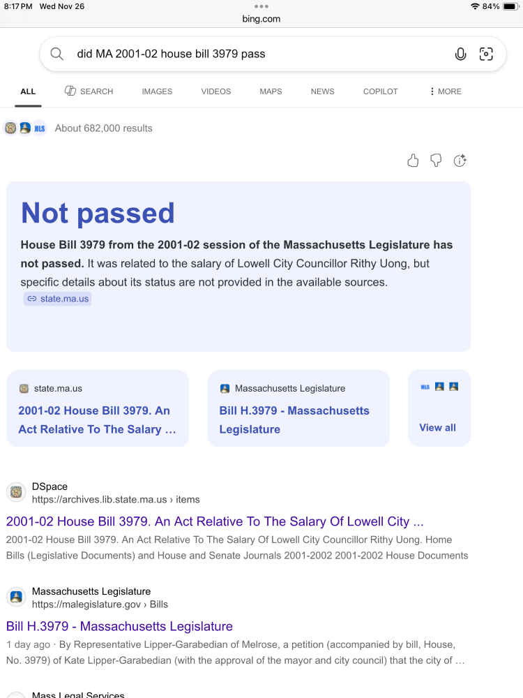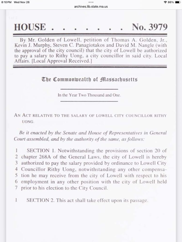 It’s been pointed out that in July of 2000, the Lowell City Council voted 8-0 to allow Rithy Ung to receive both his School Department salary and his $12,000 City Council stipend by filing a Home Rule Petition. A Home Rule petition then has to be filed as a bill with the Massachusetts State Legislature, and as you can see by the pictures below, State Reps Golden, Murphy and Nangle, along with Senator Panagiotakos, Filed bill 3979 in the 2001 session.