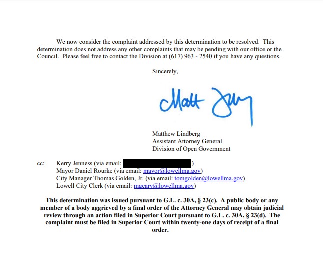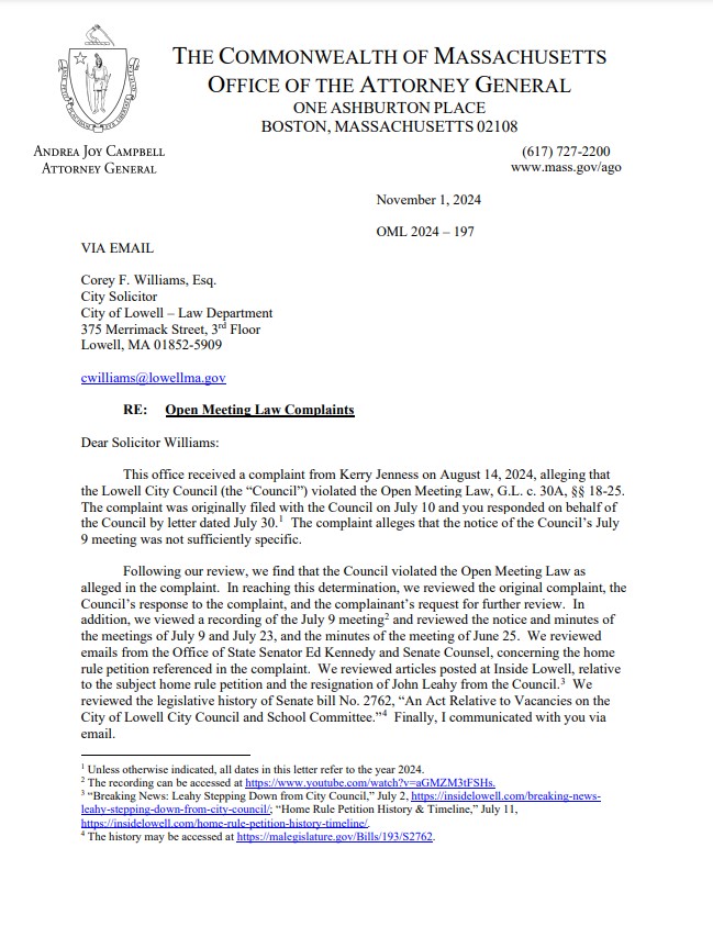 Massachusetts Attorney General Andrea Campbell’s office ruled last Friday that a discussion during the July 9 Lowell City Council meeting violated the state’s Open Meeting Law, but other than cautioning against future such violations, determined no further action was necessary.