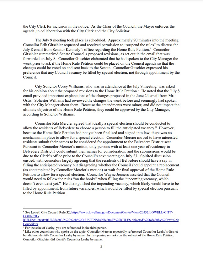 The investigation did, however, determine that an item addressing Leahy’s impending departure should have been placed on the July 9 meeting agenda, writing that Mayor Danny Rourke and City Manager Tom Golden should have reasonably anticipated that the Home Rule Petition and the Leahy seat vacancy would come up for discussion.