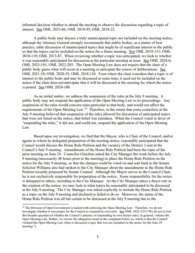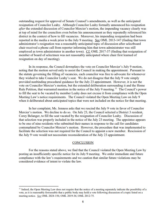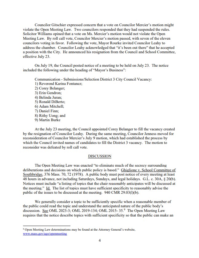 In responding to the complaint filed by former Assistant City Solicitor Kerry Jenness, Assistant Attorney General Matthew Lindberg found that the Council violated the Open Meeting Law “by posting an insufficiently specific notice for its July 9 meeting.” (Full ruling is published below)