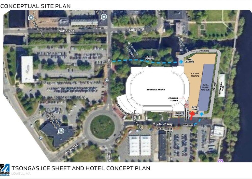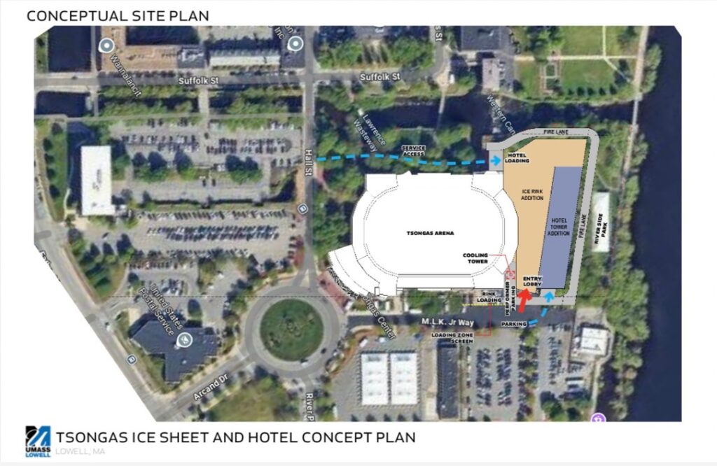 The university’s hope is that the inclusion of a hotel in the project will make the development financially feasible, as UML is not expected to contribute any financing toward the new facilities other than contributing the parcel of land behind the existing arena.