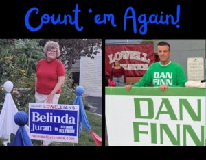 The unofficial tally released election night showed Belinda Juran with 1,143 votes to Finn’s 1,139, a scant four vote margin, with 27 blank ballots. Subsequently, an additional eight provisional and hand counted ballots were added to the total, making it a ten vote margin in favor of Juran, 1,150-1,140.