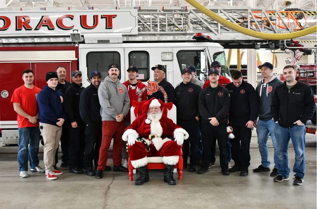 - Members of the Dracut Fire Department stand with Santa before the Jolly Ole Elf left the station. (Courtesy Steve Paris via Dracut Fire Department)