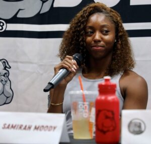 She described the discipline required of a student-athlete: 5 a.m. wake-ups, weight training, classes, practices, and community service.