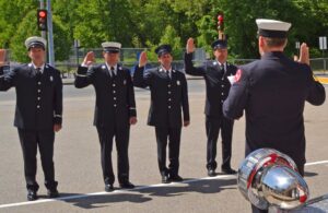 Deputy Chief Thomas Mackey, second from left, and Lt. Mark Armstrong, at right, are among firefighters sworn into new positions in 2014 outside of Dracut Fire Headquarters on Pleasant Street. (Photo Courtesy Dracut Fire Department)