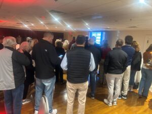 A crowd gathers around a 10-foot TV screen at Mount Pleasant Golf Club to watch results roll in during InsideLowell’s election night live coverage.