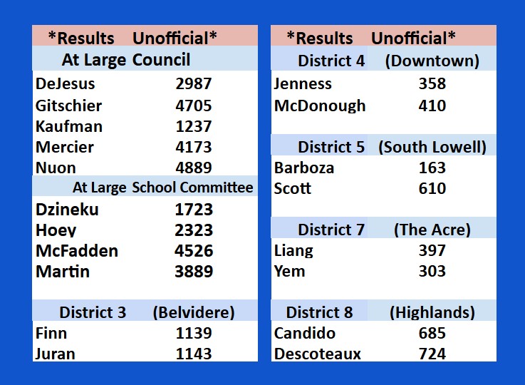 Congratulations to all of the candidates on well-run campaigns. While the total turnout of 8,494 only amounts to 10.92% of Lowell’s 77,624 registered voters, those on the ballot ran competitive races clearly laying out their differences and visions for the city going forward.