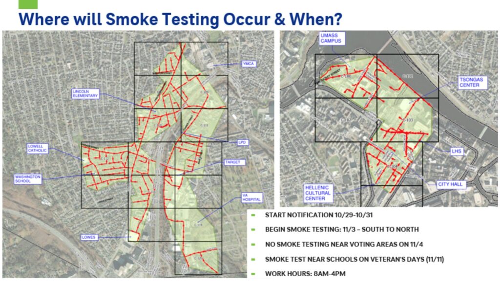 Lowell Regional Wastewater Utility (LRWWU) and the City’s contractor, Flow Assessment Services, will conduct smoke test surveys across the City of Lowell starting the week of November 3 and lasting until December.