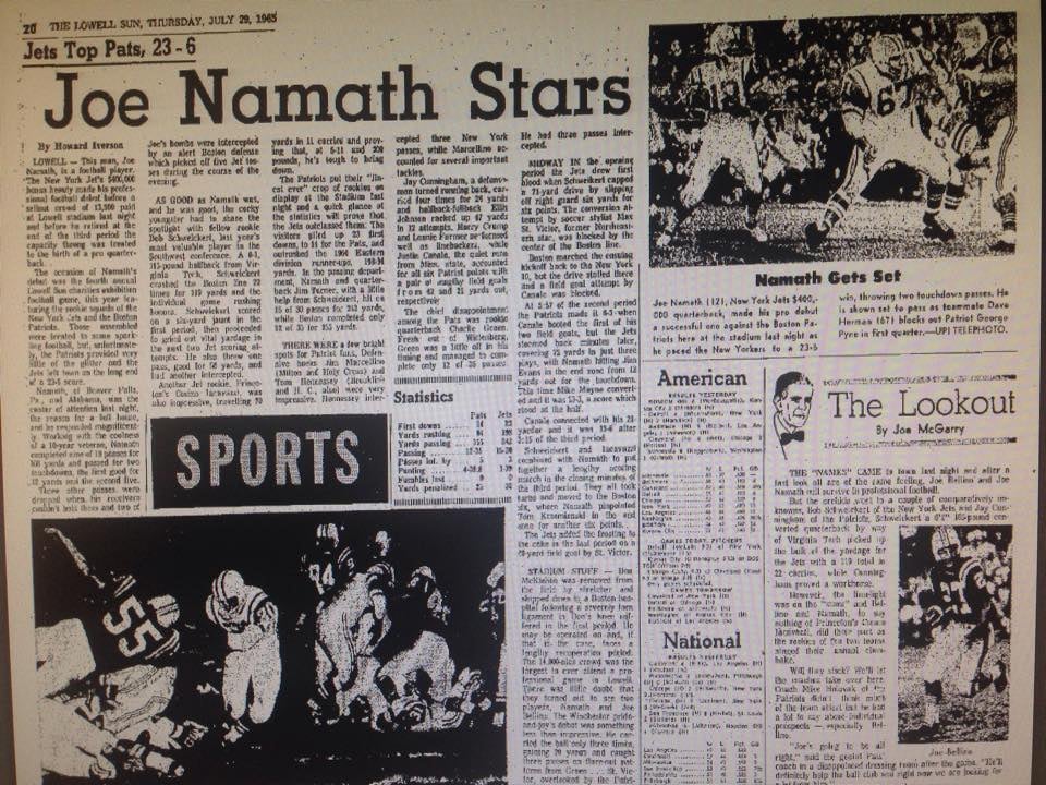 The most memorable of those was a 1964 preseason rookie game in Lowell, which featured a NY Jets rookie quarterback named Joe Namath. The game was part of an annual Lowell Sun Charities exhibition game series played at what’s now known as Cawley Stadium. It was Namath’s first ever professional football game, and it elicited a humorous exchange between Broadway Joe and Pat Sullivan, which Sullivan recounted on the Daily Pulse Podcast.