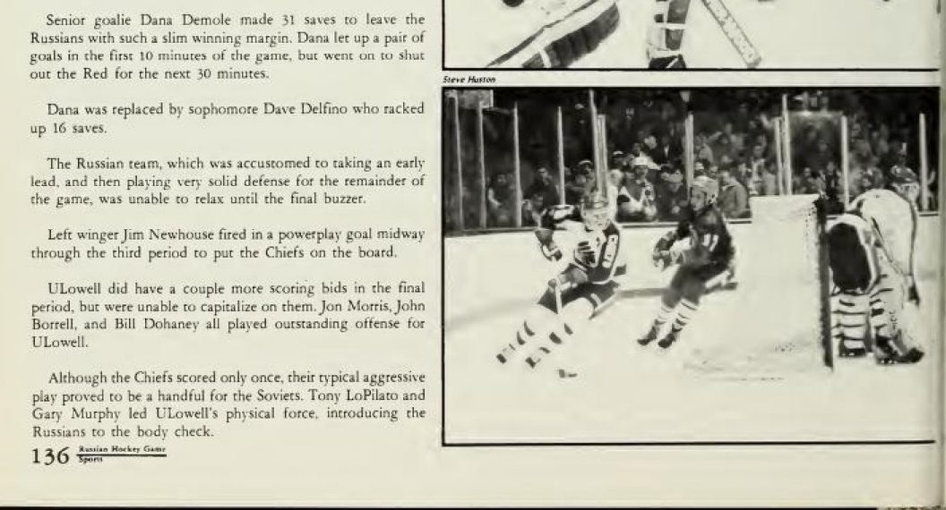The game itself turned out to be a surprisingly entertaining and competitive affair. As described in the 1986 school yearbook, the fast skating and aggressive Soviets had buried Maine (11-1) and Boston University (5-1) as they entered a sold out Tully Forum, which packed 3,300 bodies in for the exhibition game.