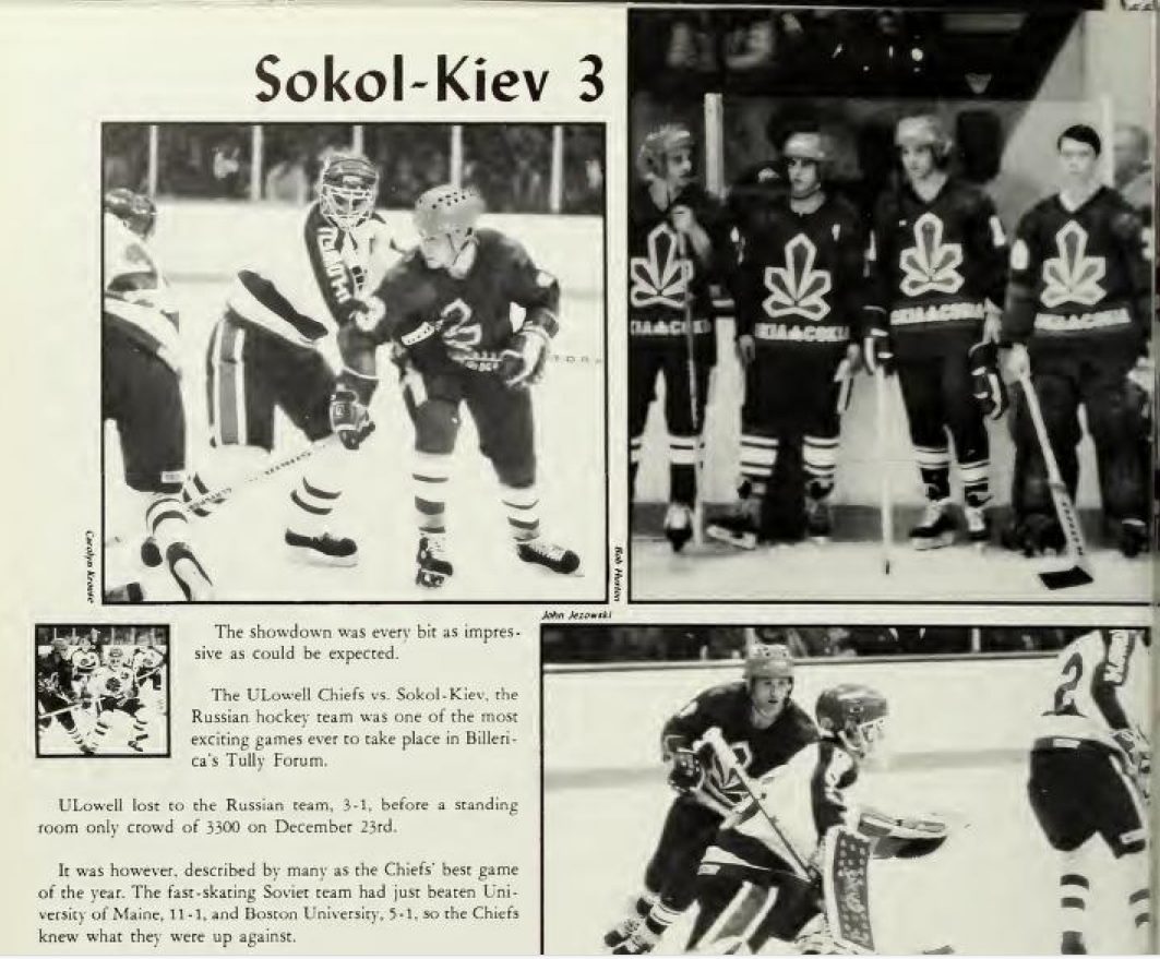 A touring team of Soviets called Sokol-Kiev visited the Mill City to skate against the local university’s college hockey team, the ULowell Chiefs, in a game played at the Tully Forum in Billerica.