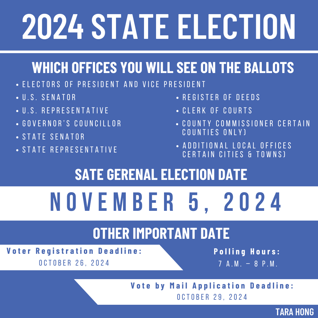 Lastly, the General Election on November 5th will include candidates for Electors of President and Vice President, U.S. Senator, U.S. Representative, Governor’s Councillor, State Senator, State Representative, Register of Deeds, Clerk of Courts, County Commissioner (in certain counties only), and additional local offices if applicable in your community.