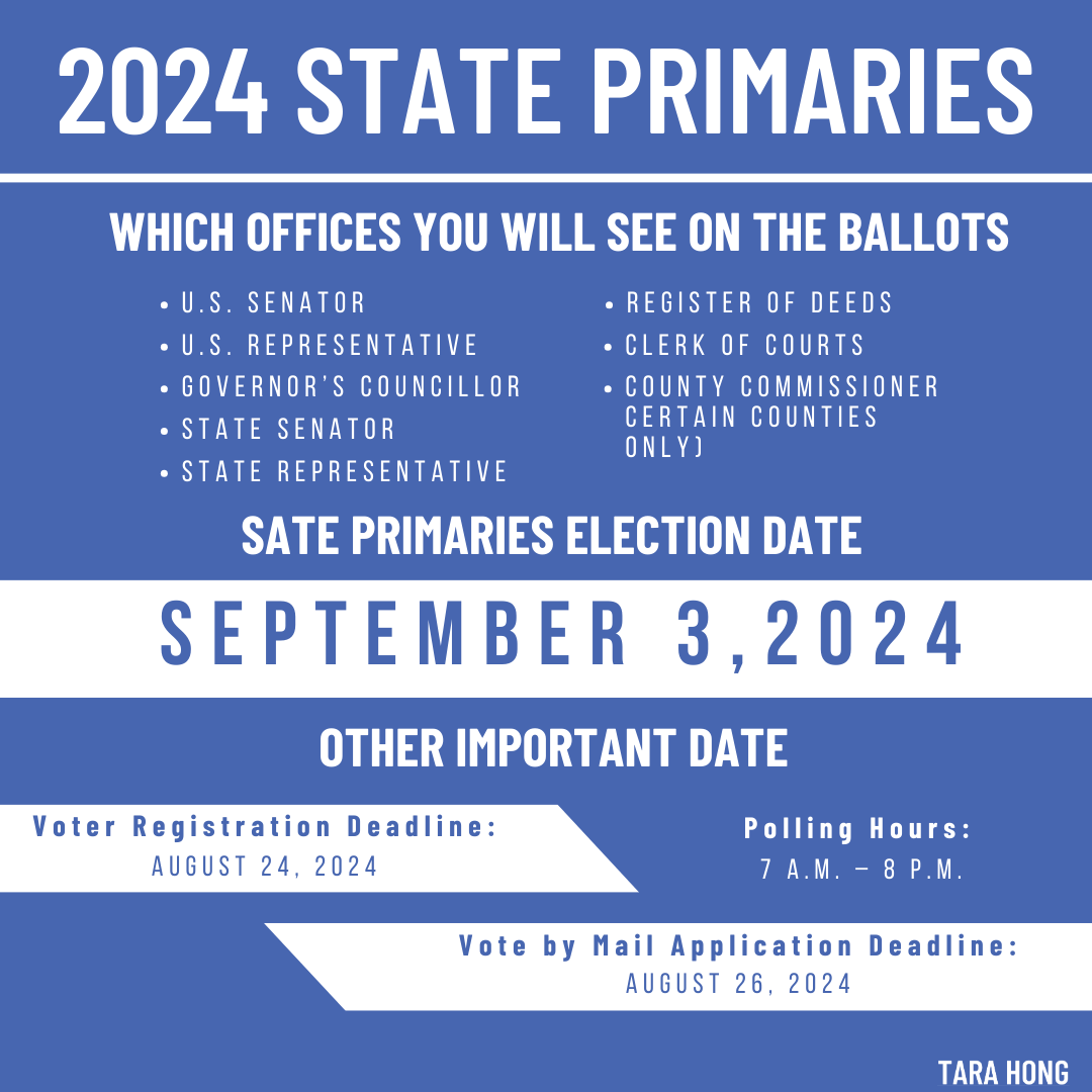Next is September 3rd for the State Primary, in which each party will choose the final candidate for U.S. Senator, U.S. Representative, Governor’s Council, State Senator, State Representative, Register of Deeds, Clerk of Courts, and County Commissioner (in certain counties only).