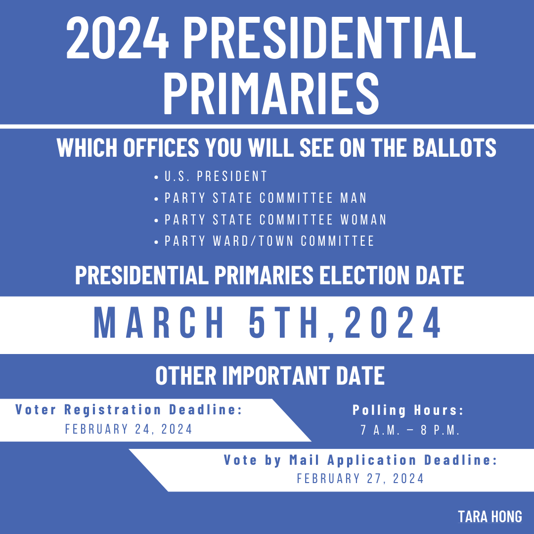 There are three elections coming up in our Commonwealth. First is the Presidential primary election on March 5th. On the ballot, you will see the names of those running for President of the United States, the Party State Committee Man and Woman, and Party Ward/Town Committee. In this election you get a ballot that matches the party you are enrolled in. If you are unenrolled, you can choose a Democratic or a Republican ballot.