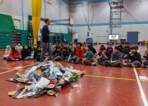 Patrick Belmonte stands in front of a pile of waste as he prepares students at Abraham Lincoln Elementary School for a hands-on lesson in how to reduce and recycle. (Photo Courtesy City of Lowell)